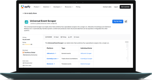 The Universal Event Scraper is an Apify Actor that combines four specialized scrapers into a single run. Allevents.in Eventseye.com District.in Meetup.com.