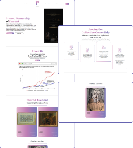 Admin can upload multiple images for each artist with the auction start date and end date. The website displays the number of fractions and highest bid amount for each image for a specific image along with the metamask connect and disconnect feature for users.